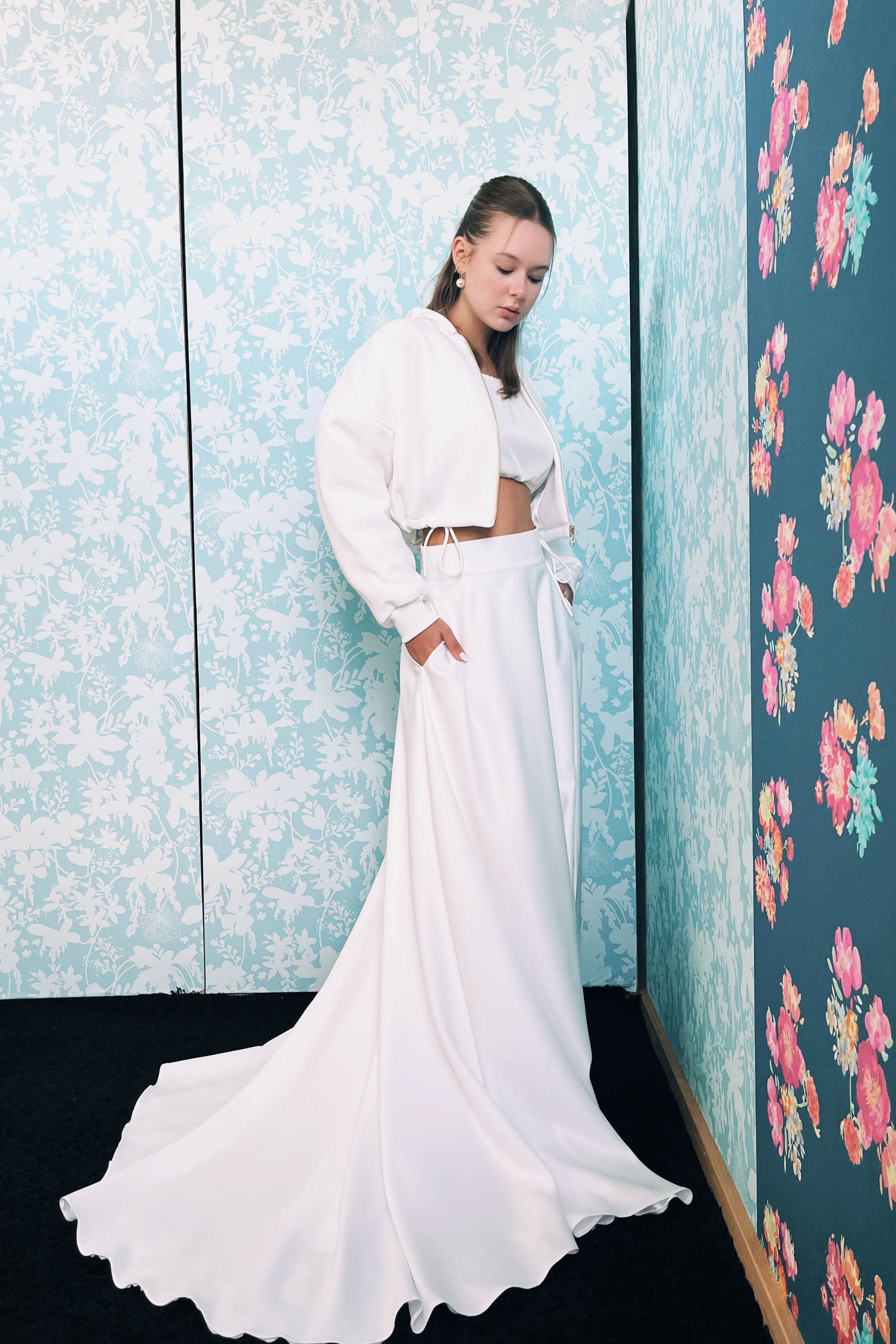 Wenn du eine unkomplizierte, bequeme und gleichzeitig moderne Alternative zum Brautkleid suchst, bist du bei uns im kommenden Jahr also wieder an der absolut richtigen Designer-Adresse! Als urbane Braut kannst du dich bspw. auf einen schulterfreien Overall mit Corsage freuen oder in der neuen, stilvollen Wide-leg Brauthose ultra lässig heiraten.