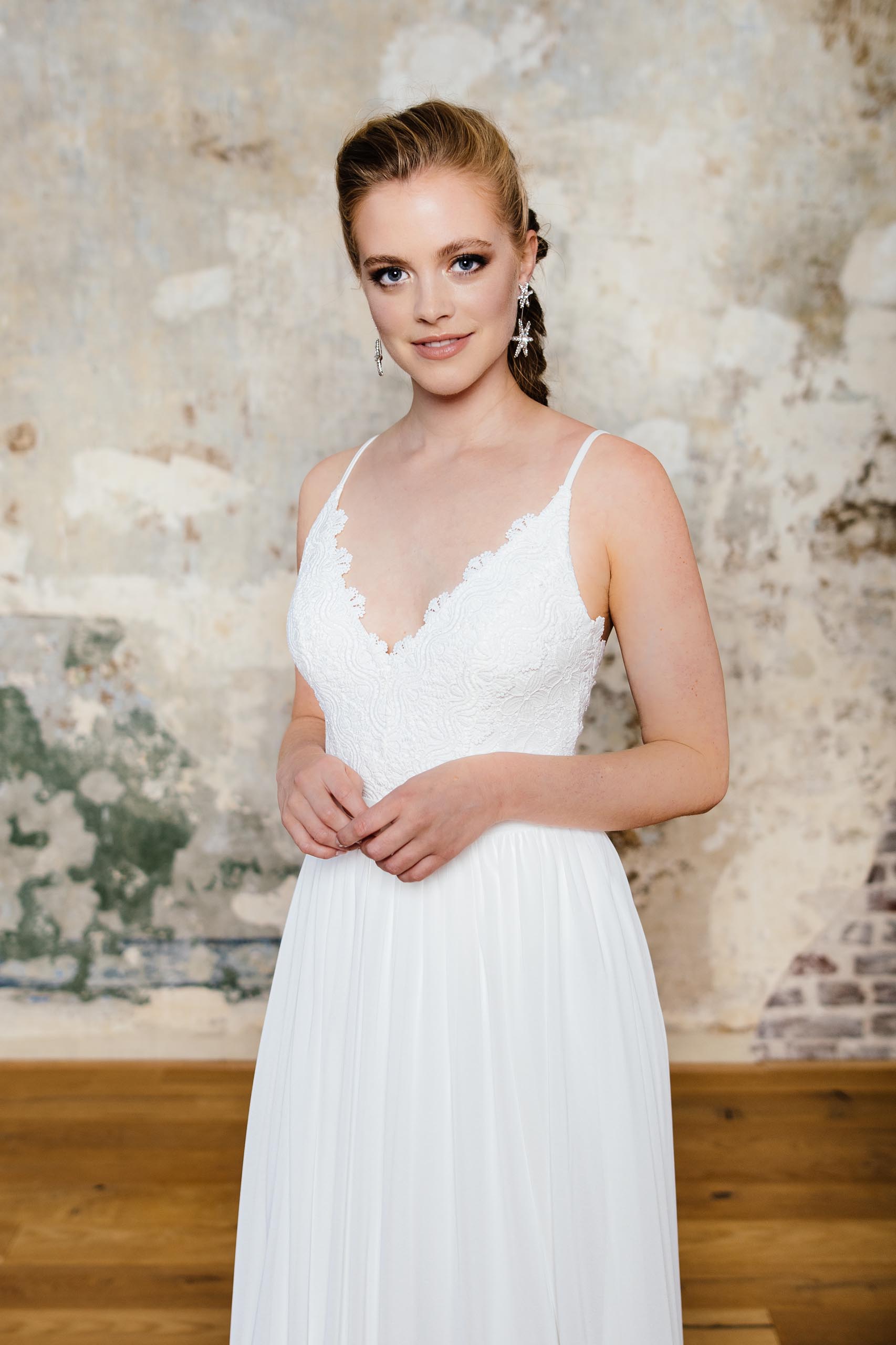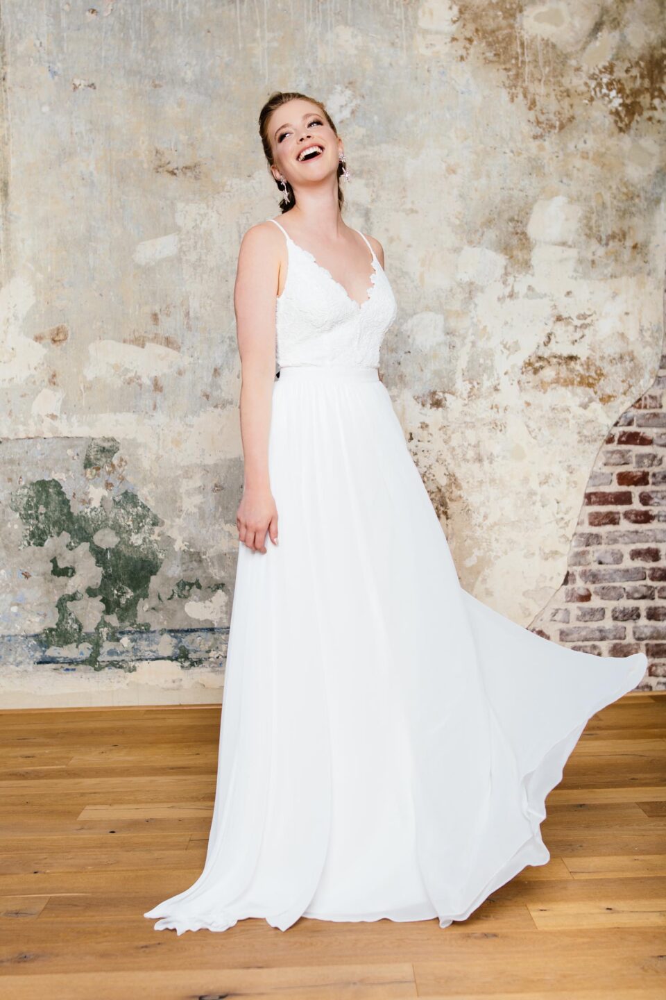 Ein Brautoutfit schöner als das andere! Grund ist unser neuer, geraffter Chiffonrock S-1040, der dir als Zweiteiler Grundlage bei deinem persönlichen Traumkleid Mix and Match zauberhafte Brautlooks garantiert.